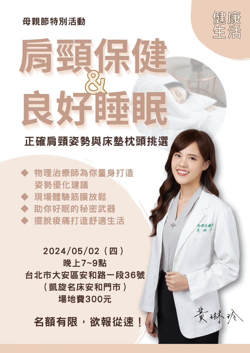 這次的課程將由國家級隨隊物理治療師,同時也是《10分鐘終結痠痛手冊》的作者黃琳玲物理治療師,帶領你找出自己的姿勢問題,為你量身打造姿勢建議,並且找到適合自己的床墊與枕頭,現場還有筋膜放鬆的體驗活動,以及助眠的秘密武器!