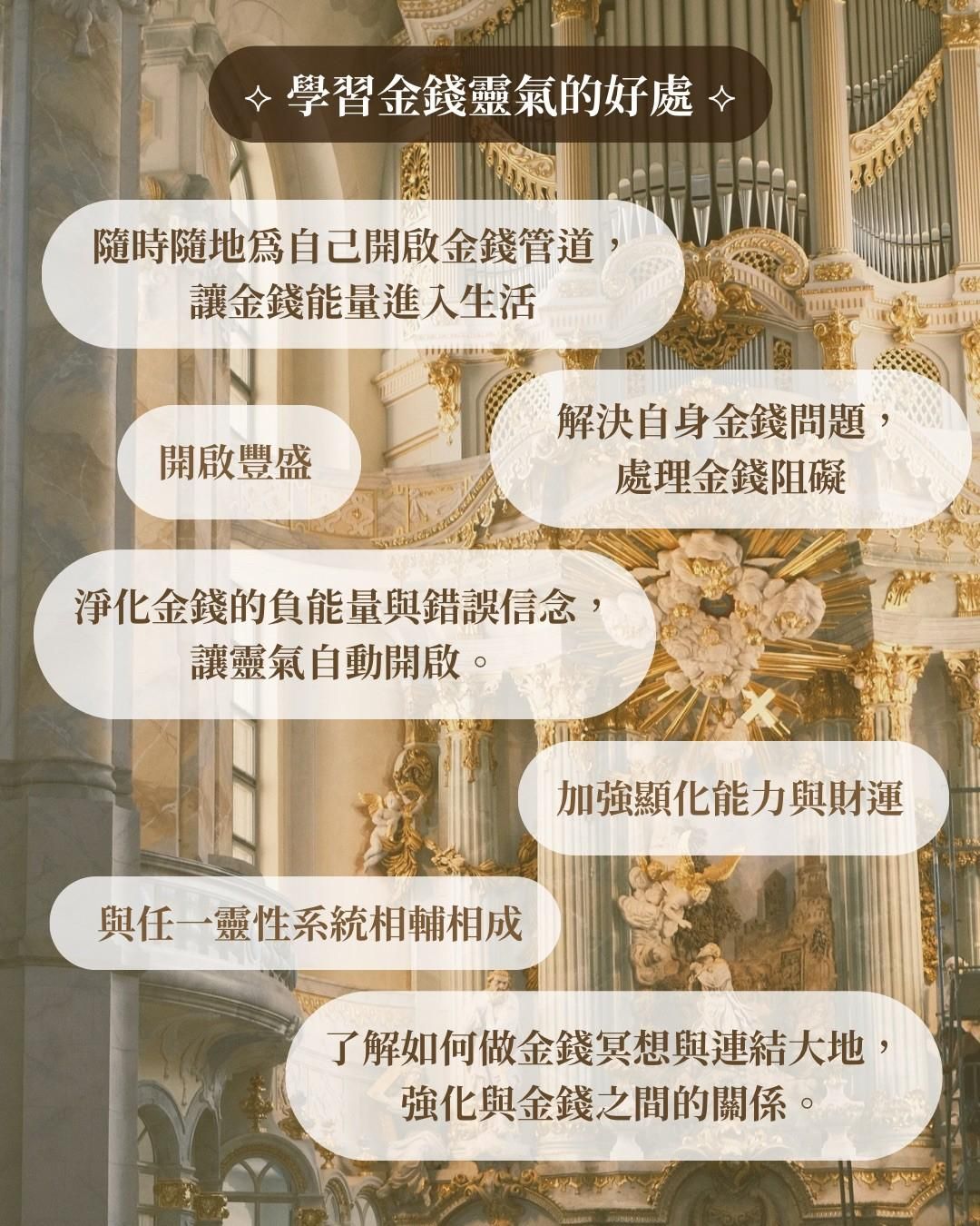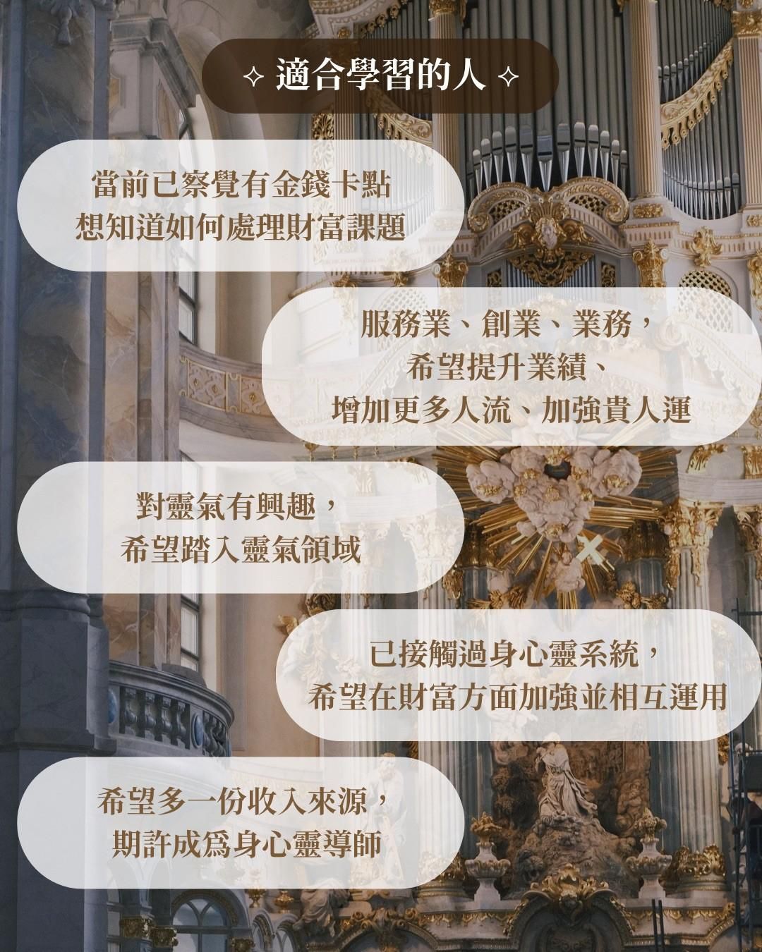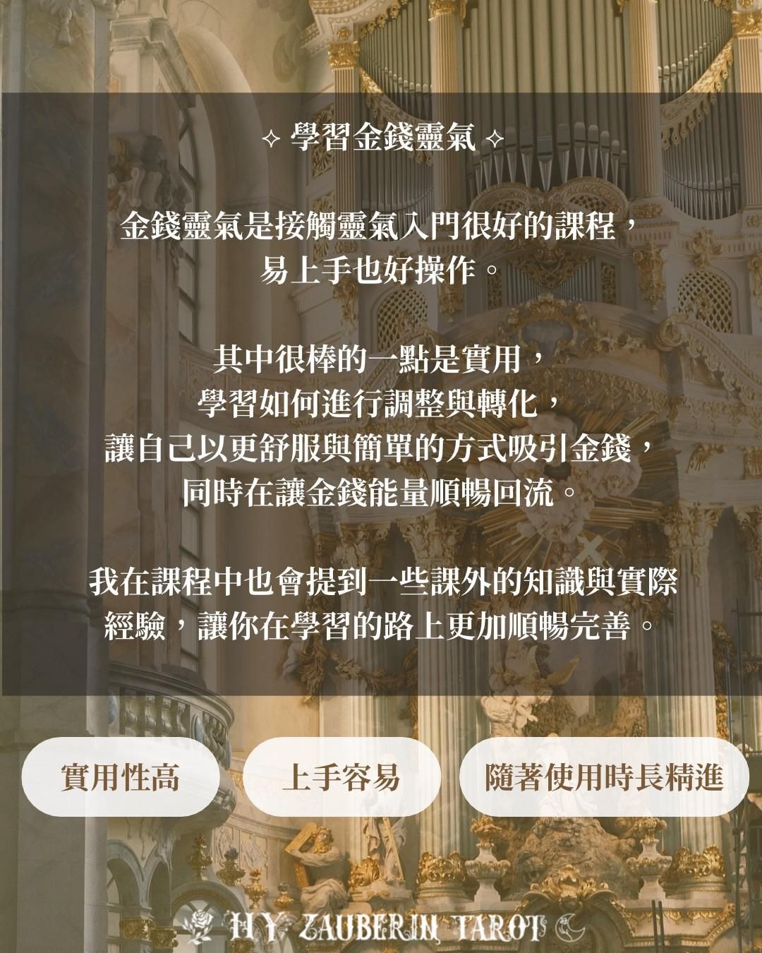 這個課程很適合靈氣入門或是想正式踏入身心靈的人,而其中我最喜歡的一點是實用,大到年度顯化,小到日常淨化,每一次的使用都是在調整自己頻率,同時在讓金錢能量順暢回流。『自然而然吸引金錢』是最棒的一件事(尤其對我這個土象魔羯的人來說),我在課程中也加入很多課外的知識與實際經驗,讓你在學習的路上更加順暢完善 💛